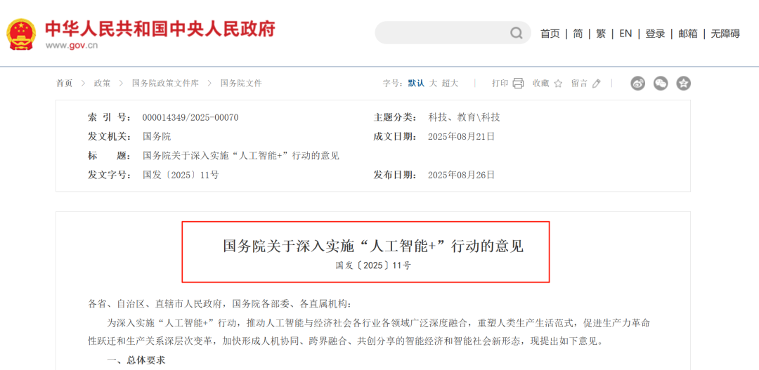 近日,《国务院关于深入实施“人工智能+”行动的意见》(以下简称《意见》)正式对外发布,引起极大关注。近年,不少AI相关政策或纲领已陆续出台,这份文件到底有什么特别的分量,和企业又有什么关系?本文将与您一同解读本次发布。