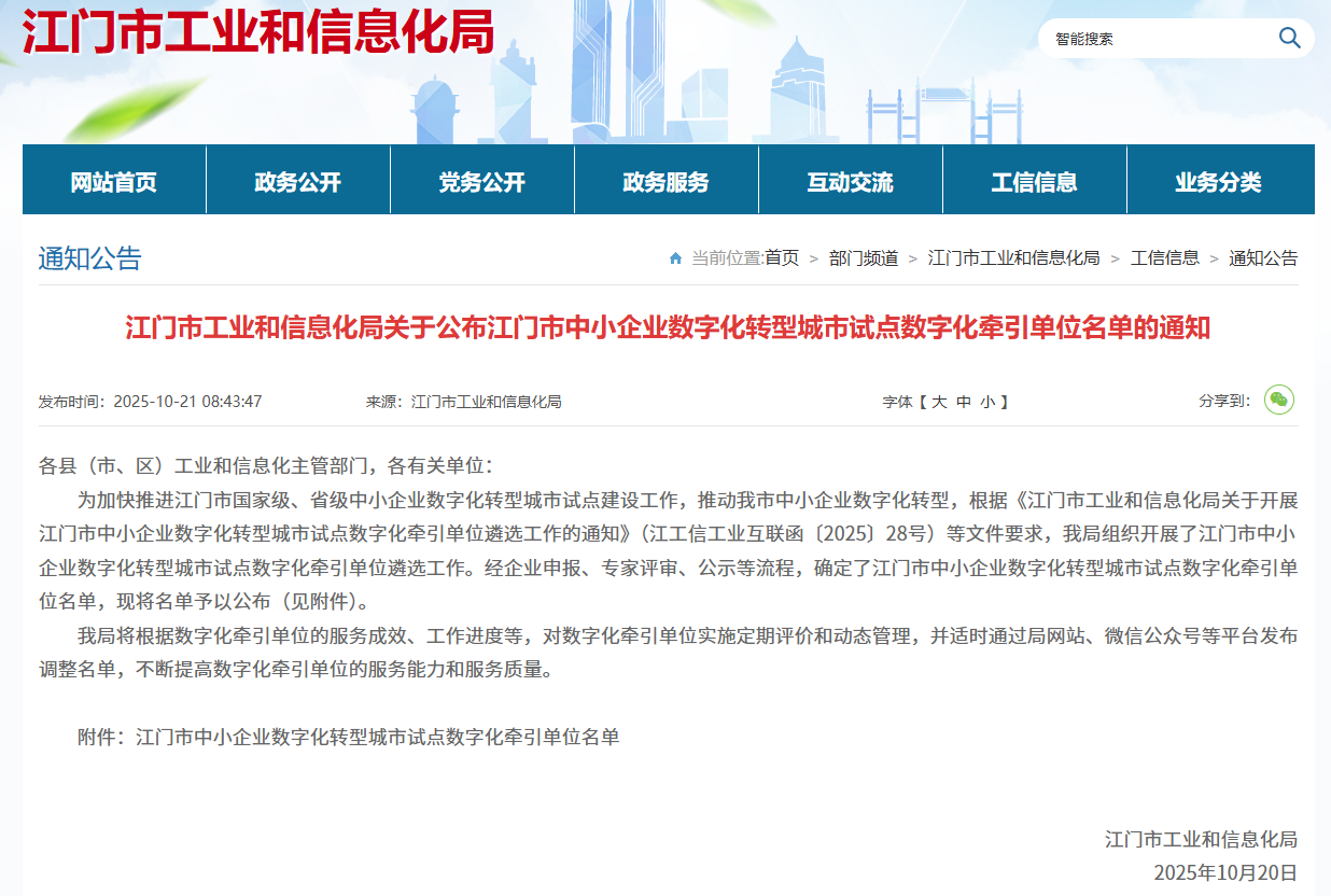 本文涉及的政策文件为《江门市工业和信息化局关于公布江门市中小企业数字化转型城市试点数字化牵引单位名单的通知》,来源为江门市工业和信息化局官方网站。建议企业在选择服务商前,查阅官方名单及评审标准,结合自身需求进行综合评估。