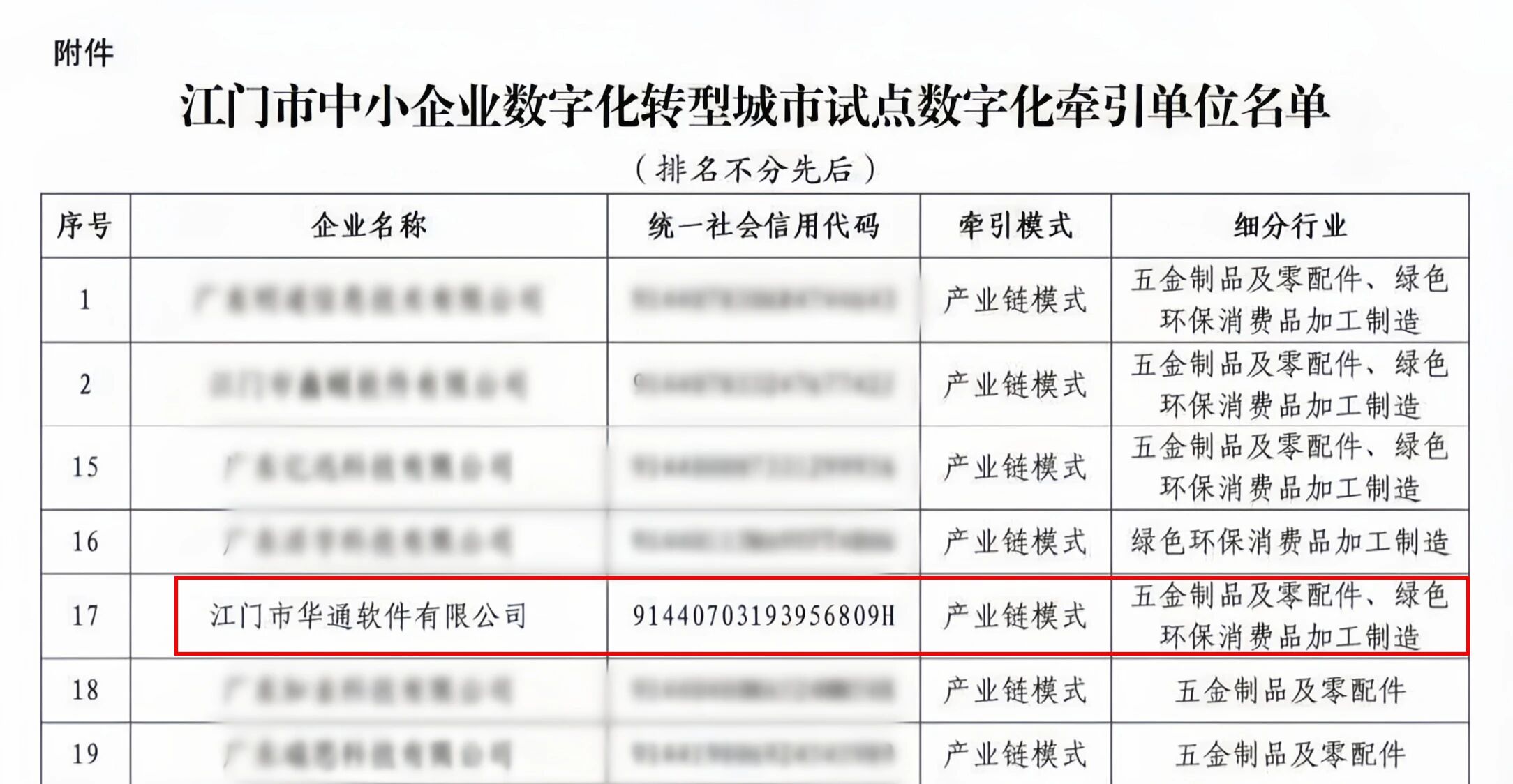 目前,江门市工业和信息化局正式公布江门市中小企业数字化转型城市试点数字化牵引单位名单。经多轮严格遴选,江门市华通软件有限公司(以下简称"江门华通")凭借在管理软件、云服务及数据技术领域的深耕积累,成功入选首批牵引单位名单。
